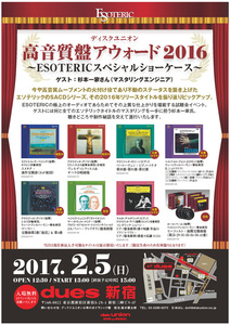 2016年に発売されたエソテリックのSACDを振り返る試聴会「diskunion高音質盤アウォード2016〜ESOTERICスペシャルショーケース〜」が、2月5日(日)にディスクユニオンのイベントスペース、dues 新宿にて開催される。予約申し込みは必要なく、入場は無料、1ドリンク代のみ負担。