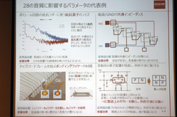 こういった思想はオーディオ向け製品にも活かされているとのこと。昨年秋にリリースしたハイエンドAVアンプ向けサウンドプロセッサー「BD34704KS2/BD34705KS2」では、「ボリューム回路の抵抗ラダーに使う抵抗素子のノイズ」「電源/GNDの共通インピーダンス」「ボンディングワイヤーの材質」など音質に影響する28のパラメーターを、メーカーのニーズに合わせて最適化することで、狙いの音質を実現したという。