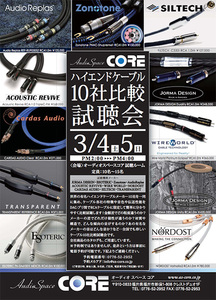 エソテリックやゾノトーンなどハイエンドケーブル10社の製品を集めた比較試聴会が3月4日・5日に福井市のオーディオスペースコアにて開催される。