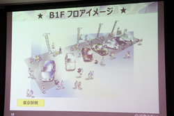 会場の構成についても紹介された。まず、東京国際フォーラムのB1Fフロアに特設会場を用意。合計700平米にもなるB1Fフロアの有楽町駅側のスペースには、音楽配信紹介ブースおよび総合インフォメーション、コンシェルジュカウンターを配置。東京駅側には、ハイレゾ対応カーオーディオを搭載した自動車8台を展示するコーナーを設ける。