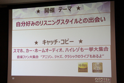 開催テーマは「自分好みのリスニングスタイルとの出会い」。リスニングスタイルや音楽ソースが多様化する中で、マニアはもちろん、普通に音楽を楽しむ方々が自分にフィットしたリスニングスタイルに出会える場を提供することを目指すという。