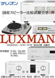 ラックスマンは、東京・秋葉原のオーディオ専門店 テレオン sound110にて、試聴イベント「国産スピーカー比較試聴会」を3月26日に開催する。