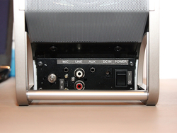 入力端子には、ライン、AUX(3.5mm)、マイクを各1系統ずつ装備。本体前面の下部にあるボタンで入力先を切り替え可能となっている。