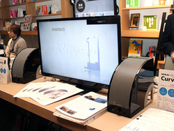 同技術について「従来のスピーカーは、じょうご型の振動板をピストンさせることで空気を圧縮させ、音を発生させているが、音源がピストン部分の一点となるため、スピーカーから距離が離れると音が拡散し、聞こえにくくなってしまう」「しかし、『曲面サウンド』は湾曲させた振動板全体から音を発生させる。ピストン運動はあまりさせいないが、じょうご型の幅のある駆動系に比べ、1枚の板を使っているため疎密波が濃く、音の拡散も少ないため、密度が濃く耳に届く」と説明。