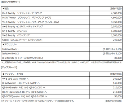 対象製品の一例として、同ブランド20周年記念プリアンプ「KX-R Twenty(シルバー)」が380万円から430万、パワーアンプ「MX-R Twenty(シルバー)」が420万円から460万円へと値上がりする。その他の製品の新価格については、以下の価格表を参照のこと。