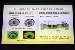 天板はアルミダイキャストに塗装したものを採用。BMC(バルク・モールディング・コンパウンド)シャーシと、アルミダイキャストシャーシを強固に一体化した2層構造を採用した。なおSL-1200Gは4層構造を採用している。