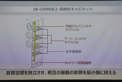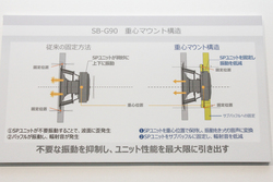 SB-G90では、エンクロージャー内部にサブバッフルを設け、ユニットの重心位置で固定・支持を行う「重心マウント構造」を各ユニットに採用。振動板が振幅したときにユニット自身が揺れるのを低減し、音の濁りを抑制する。さらにスピーカー前面のバッフルにはユニットが固定されていないので振動が直接伝わらず、エンクロージャーの不要振動を低減する効果もある。これらの効果により、明瞭な音像定位や鮮明でリアルな音場再現が得られるという。