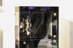 MDFによるエンクロージャーは、ポリウレタンを重ね塗りして光沢仕上げとした。内部には各ユニットを支えるサブバッフルに加え、水平補強板を組み合わせたクロス構造を採用。さらに角の部分にも補強を加えることで、エンクロージャーの高剛性化を実現した。