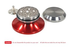 「Dharma」は円盤を2つ積み重ねたような形状をした、オーディオ機器の上に乗せて振動を制御するレゾネーター。その形状から、ターンテーブル上でレコード盤を固定するレコードクランプとして用いることもできる。内部にはセラミックベアリングやバネを組み合わせた軸と、最大で5,200個ものステンレスボールを収納。「振動を熱エネルギー変換によって効果的に消滅」させ、「高域の倍音と残響の向上によって各楽器の音色が明瞭になり、情報量の増加とダイナミックレンジが拡大する」という。