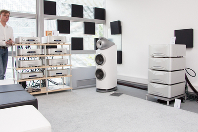 エソテリックは、ハイエンドブランドが集結する会場の「Atrium」ゾーンにブースを構え、モノラルパワーアンプ「Grandioso M1」を4台用いてB&Wの旗艦スピーカー「800 D3」をバイアンプ駆動するシステムなど、旗艦シリーズ「Grandioso」をメインとした超弩級システムでそのサウンドをドイツのファンに示した。