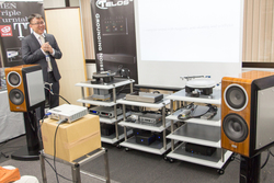 トップウイング・サイバーサウンドは、今年3月に発表会を行い取り扱いを開始したアナログプレーヤーブランドTien Audio、およびオーディオアクセサリーブランドTELOS Audio Designの主宰者を招いた製品説明会を実施。Tien Audioのジェフ・ティエン氏、およびTELOS Audio Designのジェフ・リン氏がそれぞれプレゼンテーションを行った。また、iFI-AudioやM2TECHなど同社取り扱いブランドのアナログ関連製品も多数出展されていた。