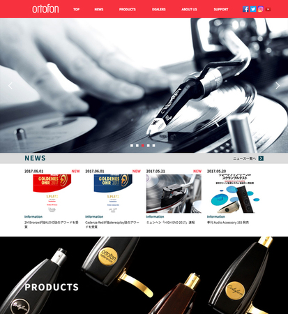 ホームページでは、同社が取り扱うortofonの全製品、およびAcoustic Solidのアナログプレーヤー全製品を掲載。美しい写真やビジュアルイメージをふんだんに用いて、Hi-Fi/DJカートリッジやケーブル、トーンアーム、イヤホンに至るまでを紹介している。