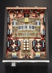 本機は高い品位とナチュラルな質感が得られるCR型を採用。このCR型のフォノアンプ部はモジュール化にすることで、ハンドワイヤリングの良さと、プリント基板並の経路の短さを実現。真空管6本(E88CC×2本、6072×4本)と大型の銀箔コンデンサー等を搭載しながら、基板サイズを最小限のサイズに抑えている。