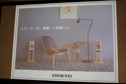 プレゼンテーションは同社の八重口能孝氏が行った。この桐スピーカーは、市場のニーズに応えるという一般的な製品企画に基づいたものではなく、オンキヨーがこれまでに築いてきたスピーカーのノウハウや最新技術をコスト度外視で投入して、理想的なスピーカーを実現することを目指して開発が行われたとのこと。
