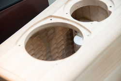 新開発のウーファーユニットの性能を最大限活かすためにエンクロージャーの素材として選ばれたのが、桐素材だった。桐は軽量かつ多孔質なので、適度にエネルギーを吸収することができ、高域に著しいエネルギー・ピークのない、自然な振動・響きを可能にするという。
