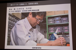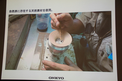 発表会では、この桐スピーカーの開発者であるオンキヨー(株) 開発技術課の井上岳氏の「音に魂が宿っている、と感じるくらい、音を自然に、ありのままに感じられるスピーカーをつくりたかった」という言葉が紹介された。またこのスピーカーの随所に自然素材が用いられている理由は、それは「自然素材を用いることで、自然の音が出せる」という思想に基づいているとした。