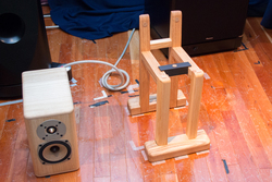 専用のスピーカースタンドも用意。やはり木製で、タモ材を使用。一部には黒檀を用いている、タモ材の表面はオイルフィニッシュとしている。また、重心支持構造を採用。スピーカー自体の振動モードを解析して、スピーカーの特性を最大限活かせるように設計されている。