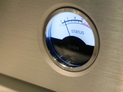 外部クロックジェネレーター「CG-10M」には4系統のクロック出力端子を装備。OCXOを採用している。中央のメーターがデザイン上の特徴で、このメーターでは、温度を一定にするための電流の状況がわかる。針が静止していれば安定した状況ということだ。