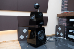 低域については、NCV振動板と17,000ガウスの強力磁気回路による250mmウーファーを対向配置してメカニカルに連結。さらに各ユニットで独立空気室を備えることで、各ユニットの機械的干渉および空気の干渉を徹底排除した。このユニットを駆動するデジタルアンプにはDSPを搭載し、4パターンのプリセット周波数特性を選択することができる。