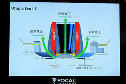 ニコラス氏は「FOCALの一番の強みは、技術力だと考えている。FOCALのR&Dには2つの意味があって、ひとつは『新製品の開発という意味』、もうひとつは『生産をする際の機械や治具を開発する』という意味。製品を開発・生産する過程で、2つの開発部門があることで、技術革新が効率的に行える」と、同社が持つ技術力の高さを強調。その上で、FOCALのスピーカーのキーとなる3つのテクノロジーに触れた。