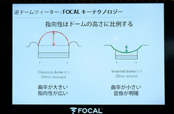 また、逆ドーム型ではドームの高さを低く(曲率を小さく)できるため、より明確な音像再現が可能になるという。構造的にもドーム型より強度が高く、バランスの良い放射性を確保できるとのこと。
