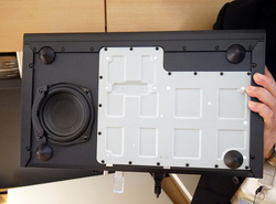 筐体前面には8cmウーファー×2、2cmシルクドームトゥイーター×2を搭載。また12cmのサブウーファーを底面に備えている。なおサブウーファーは独立駆動のバイアンプ構成となっている。またデュアルロングポートも備え、40Hz〜50kHzの広帯域再生を実現した。