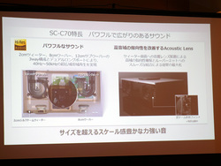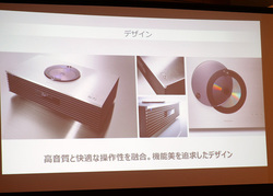 デザイン面は、“OTTAVA”「SC-C500」のテイストを継承し、円形のCDドライブカバーを採用。CDが回っているところを見て楽しむことができる。天板はアルミフィニッシュとしてシンプルさと機能美を演出。また前面はルーバーデザインとして新味を出した。外形寸法は450W×143H×280Dmm。