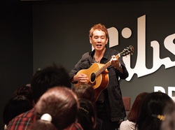 イベントも終わりに差しかかった時、「集まっていただいて一曲も歌わないのもあれなので…」と弾き語りのサプライズで、客席からどよめきと拍手が。会場のGibson Brands Showroomにはギターが展示してあり、その中からGibsonのアコースティックギターをチョイス。アルバムから「今の君がいちばんいいよ」を熱唱した。