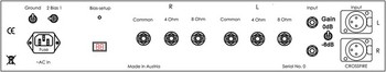 周波数特性は8Hz〜35kHz/0dB、S/N 98dB。入力インピーダンスは100kΩ、出力インピーダンスは4Ω / 8Ω両対応。入力端子はXLRまたはRCA(排他利用)。外形寸法は520W×420H×250Dmm。質量45kg。