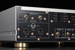 バランス出力端子については、試聴を重ねて独自に開発したオリジナル端子を採用。ピンアサインは2番HOT固定となる。バランス出力のオン/オフも可能。また、アナログRCA出力端子には、金メッキ削り出しタイプを装備している。