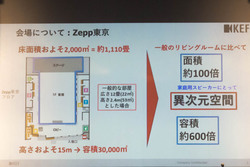 会場の「Zepp Tokyo」は、床面積が約2,000m2、高さおよそ15mのライブハウス。一般家庭のひと部屋を広さ12畳、高さ2.4mとした場合、面積は約100倍、容積にして約600倍もの空間となる。音の反響に関わる壁面や天井のデザイン/材質も大きく異なるため、淺井氏は「(Zepp Tokyoは)家庭用スピーカーにとって異次元空間」と説明した。