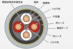 導体の周囲は銅箔テープ、電磁波吸収製非磁性糸、シルク糸に加え、同社独自のポリオフレフィンを主成分とした絶縁体、介在層、内シースが取り巻く。介在層にはタングステン、アモルフォス粉体、内シースには制振性パウダーなどを配合。外来ノイズの影響を最小化し、高いSN比を実現したとする。音質に与える影響について同社は、「繊細感あるいは解像度が向上したスピード感や立体的な空間表現に満ちた聴感を楽しむことができる」としている。