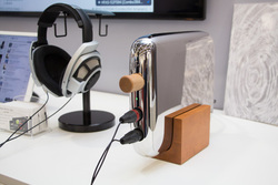 同社ブースでは、HFAS1の出力先として、RE・LEAFのDAC内蔵ヘッドホンアンプ「E1R」も用意されていた。本機は世界初という帰還型の電流駆動ヘッドホンアンプで、ステンレスブロック切削による強固な筐体、最終段にコンデンサーを用いない「4重安定化電源」などを特徴としている。