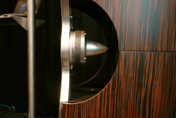 ウーファー4基にトランスミッションラインを組み合わせた強力な低域再生能力を誇るfenestriaだが、特にユニークなのがその振動対策だ。基本的にはTMDを応用したものだが、fenestriaでは側板自体を自由に動く構造としたことで、高層ビルの地震対策に用いられるマスダンパーのような働きを持たせている。つまり、ユニットが音を出すことによる振動を、fenestria自身がキャンセリングできる構造となっており、これにより純粋にスピーカーユニットからのサウンドのみをリスニングポイントへ届けることを可能にしたと、開発陣は自信をのぞかせる。