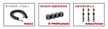 今回の試聴会では、3つのカテゴリーのアイテムを用意。ひとつは定番のルームチューニング「Azteca」「Watayuki」など、音場空間を整えるアクセサリー。