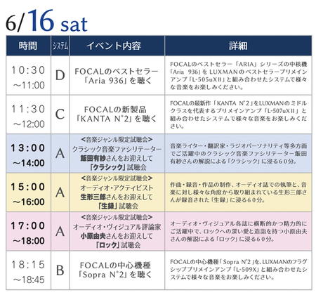 試聴システムは下の表のように4種類を用意。16日・17日の両日にわたって、製品を軸にした試聴会、オーディオ評論家らを招いた「音楽ジャンル限定試聴会」を行う。各イベントの内容や実施時間、使用システムについても下の表を参照のこと。