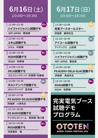 完実電気は、今週末16日(土)・17日(日)に開催される日本オーディオ協会主催「OTOTEN 2018」(事前来場者登録はこちら)に出展。同社ブースにて、オーディオ評論家を招いた試聴イベントを2日間にわたって多数実施する。ブースは東京国際フォーラム G棟4階 G402。