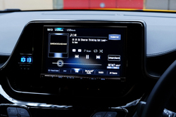 三菱電機はDIATONEのサウンドシステムを、トヨタ車に搭載。2台が用意され、プリウスには同社カーナビゲーションシステムのフラグシップとなる「NR-MZ300PREMI」とプリウス純正スピーカーの組み合わせ、C-HRにはNR-MZ300PREMIには「DS-G300」スピーカーおよびサブウーファー「SW-G50」を載せた。