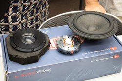 横浜ベイサイドネットは、同社が輸入するSCANSPEAKのスピーカーユニット「18WE/4542T00 18cmペーパーコーンミッドウーファー4Ω」と「D3404/552000 34mm ドームトゥイーター4Ω」を紹介。いずれも楕円ボイスコイルを採用して分割振動共振点の摂動と超低歪みを実現しているとのこと。イベントではこれらを搭載したスピーカーのデモも行った。