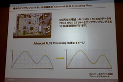 Advanced AL32 Processing Plusは、同社独自のアナログ波形再現技術の最新バージョン。独自のアルゴリズムで44.1kHz/16bitのCDデータを705.6kHz/32bitへアップサンプリングおよびビット拡張を行うことで、デジタル化で失われた情報を補間し、本来のアナログ波形を再現するとする。なお、Advanced AL32 Processing Plusはハイレゾ音源の再生にも適応される。