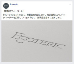 facebookへのティザー投稿第一弾では「ESOTERICは7月25日に、新製品を発表します。発表日前に少しずつティーザーを公開していきますので、発表日当日までお楽しみに。」とのみアナウンス。ブランドロゴが刻印された本体の一部らしい写真が添えられている。