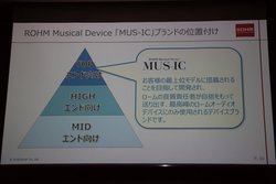 ロームの高音質オーディオ分野における開発戦略とブランディングについても説明され、同社の岡本成弘氏が詳細を語った。この中で、オーディオ向けICのトップエンドを「MUS-IC」ブランドとして展開することも発表された。MUS-ICは「MUSIC」と「IC」を組み合わせた造語で、最高峰の音楽表現を実現するオーディオ用ICであることを意味しているという。