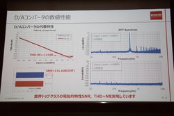 後述するように、このDACチップはリスニングテストをベースとした音質設計を重視しているが、一方で数値性能の高さもアピール。S/N 131.6dB、THD+N 115dBという特性を実現している。一方で本DACは開発段階であり、この値も最終的なものではなく、さらなる数値性能の向上を目指して追い込んで行く予定という。