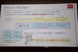 技術的な詳細についても言及。DACの出力方式は主に電圧出力型(スイッチトキャパシタ型)と電流出力型(電流セグメント型)があるが、高い数値性能と共に音質設計の自由度も重視して、本DACチップでは電流出力型を採用した。本方式はI/V(電流/電圧)変換回路を外部に用意する必要があるため、セットメーカーの求める音作りを行いやすいと言える。また、電流出力型は出力電流を多く取ることで信号レベルを大きくできるため、高いS/Nが実現できるという。