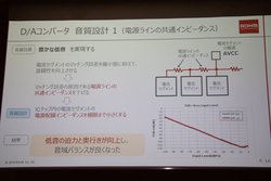 電流セグメントとは、ΔΣ変調されたパルス密度変調波を多数のスイッチで切り替えアナログ変換する方法で、このスイッチ切り替えのマッチング誤差を最小化することが音質向上に寄与するという。本DACチップではマッチング誤差の原因である電源ラインの共通インピーダンスを極小化することで、低音の迫力と奥行き、さらには帯域バランスを向上させることに成功したと佐藤氏は説明する(詳細はこちらの記事も参照のこと)。