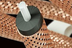 ケーブル内に配置される2つの導体は、複数のケーブルクリップを数珠つなぎにしていく過程で、一定の間隔を保ったまま螺旋状に配置される設計となっている。これにより2つの導体は完全に中空に浮かされた状態、かつまったく同じ長さで末端から末端まで到達するとのこと。この構造により完全空気絶縁を実現すると共に、軽くフレキシブルな取り回しの良さも兼備するという。