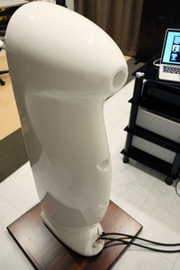 エンクロージャーは炭素繊維とガラス繊維樹脂を採用し、ハンドポリッシュピアノ塗装仕上げとした。その設計は「箱を鳴らさない設計思想で、デザインは脊髄がモチーフ。各ユニットごとにポートを設けていて、周波数を変えている」(柴野氏)という。
