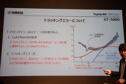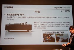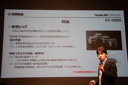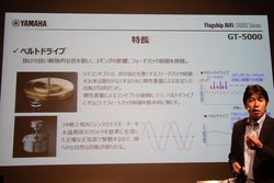 発表会では、5000シリーズの製品企画を手がけたヤマハ(株)熊澤進氏がGT-5000の詳細について説明を行った。また、設計を行った阿部紀之氏も登壇し、「GTシリーズではレコード盤の情報を素直に取り出すことを目指して、従来のGT-2000とは異なる思想も取り入れている」と述べた。