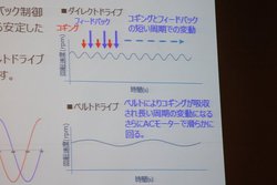 しかしダイレクトドライブ方式においては原理的に、コギングを回避するために電気的なフィードバック制御を行うことになるため、表面的には回転が安定するものの、自然界にない動きが発生。これが音抜けの悪さに繋がるとのこと。一方でベルトドライブは、ベルトにより適度にコギングが吸収され長い周期の変動になり、さらにACモーターによって滑らかな回転が確保できるという。