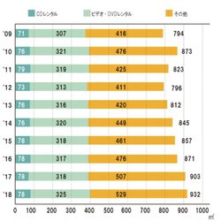 1店舗あたりの店舗面積に関しては平均932m2で、こちらは前年に比べて3.2%増加。内訳はCDレンタルが前年からほぼ変わらない78m2、DVDレンタルが前年比2.1%増の325m2、その他が前年比4.4%増の529m2となる。この結果から、CDやDVDのレンタル以外の書籍・コミックのレンタル・販売等のサービスの拡大傾向が続いていることがわかる。